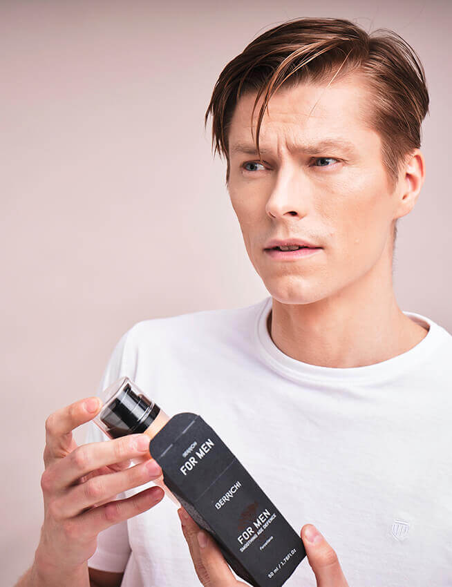 Men’s skin produces more sebum, making it more prone to inflammation. Even though the skin may be oily, that doesn’t reduce the need for moisturizing — in fact, the skin often produces excess oil when it lacks proper hydration. It’s best to start with cleansing, using a specialized facial cleanser. Only after cleansing should you apply a face cream suited to your skin type. Normal and dry skin benefit from a more hydrating cream, while oily and combination skin prefer an oil-free formula.Taking into account the structure of men’s skin, Berrichi has created a dedicated face cream for men. Its lightweight formula balances the skin both day and night. The active ingredients — the algae-derived antioxidants astaxanthin and furcellaran — act like natural boosters for the skin. Customers especially love using this cream after shaving, as it contains aloe vera, known for its soothing and calming properties.